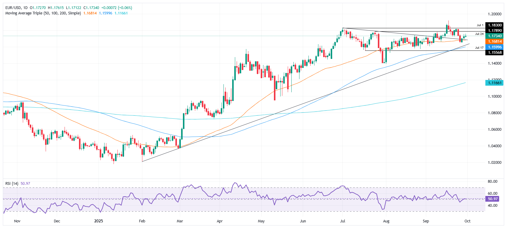 在北美时段,欧元/美元在周二保持坚挺,侭管由于可能的政府关门可能会干扰美联储官员发布关键就业数据的担忧,美元走弱。撰写时,该货币对交易于1.1735,微幅上涨0.05%。