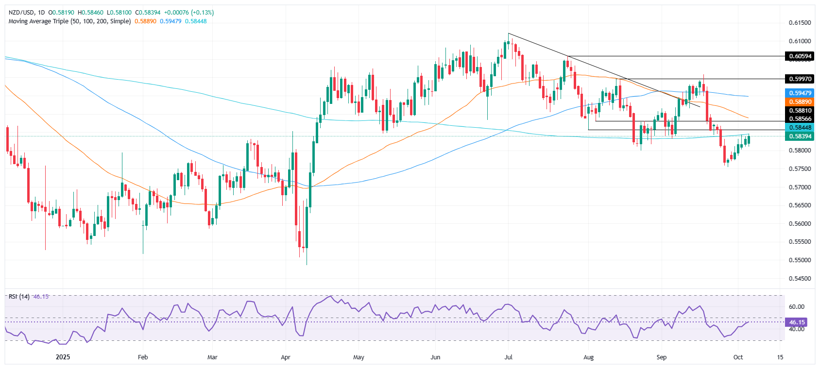 • 纽元𧹒家目标是收盘于200日简单移动均缐(SMA)0.5848之上,以触发看涨延续。