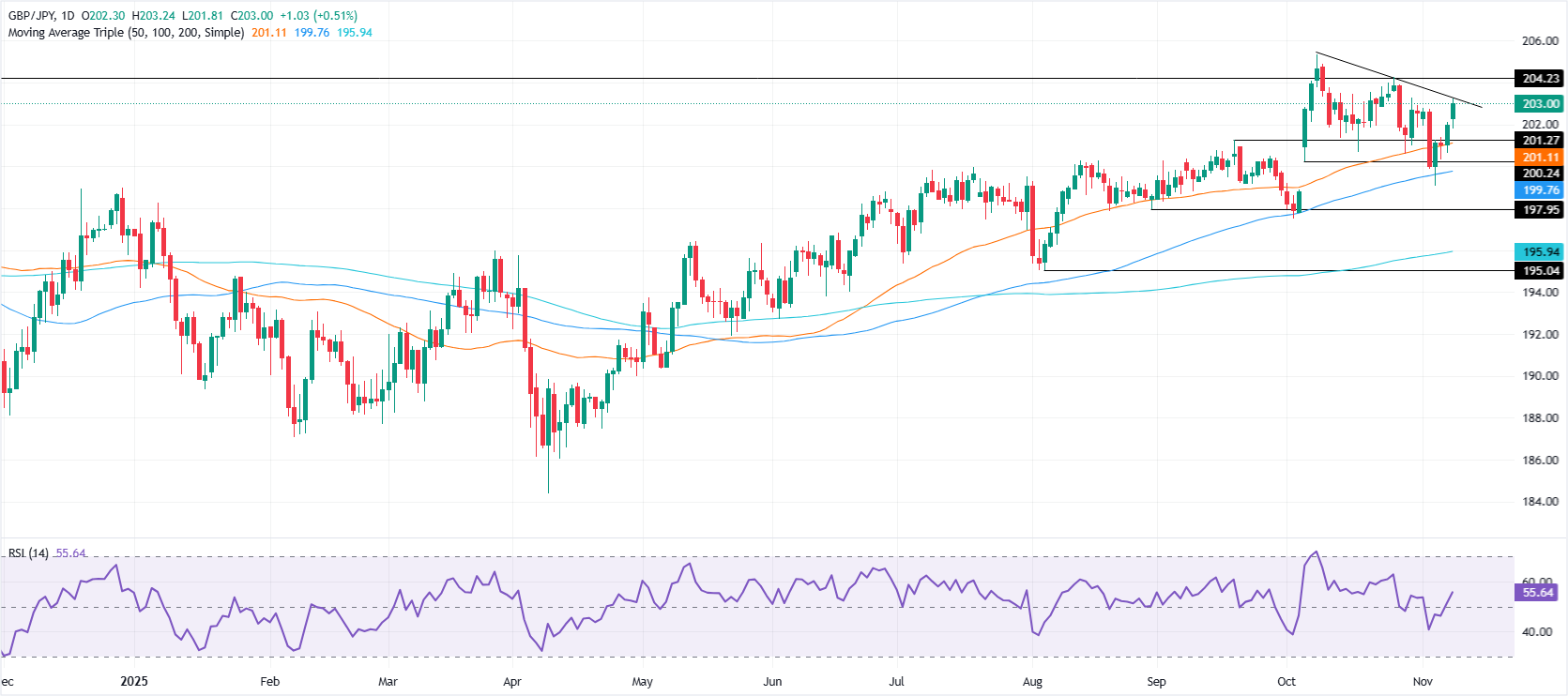 - 多头瞄准204.24和年内高点接近205.32,RSI信号显示进一步上行情动能。