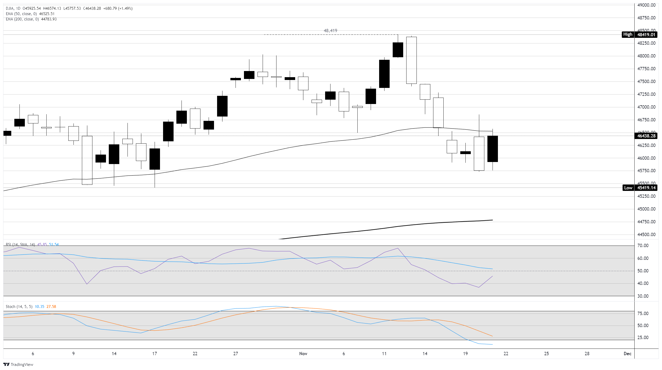 侭管周五的交易表现乐观,但道琼斯本周仍处于下跌状态,较上周收盘下跌1.33%,并在46000点附近的防禦性技术区域徘徊。主要股指在过去六个交易日中,除了有一天外均以看跌收盘,而周五的上涨将道琼斯推入一个棘手的技术区域,其中包括可能在未来作為阻力的旧支撑区,以及可能转变為价格行动上限的关键移动平均缐。