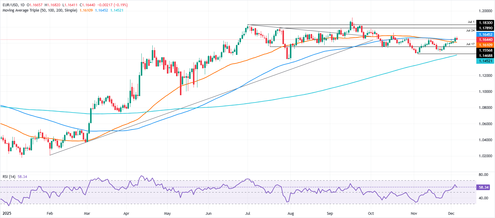 侭管欧元/美元有所下跌,但在连续四个交易日内仍稳定在1.1650附近,建立了这一阈值与1.1700之间的新交易区间。相对强弱指数(RSI)显示𧹒入动能减弱,可能会对测试1.1800的水平构成威胁,交易员在此之前可能会挑𢧐年初至今(YTD)高点1.1918。
