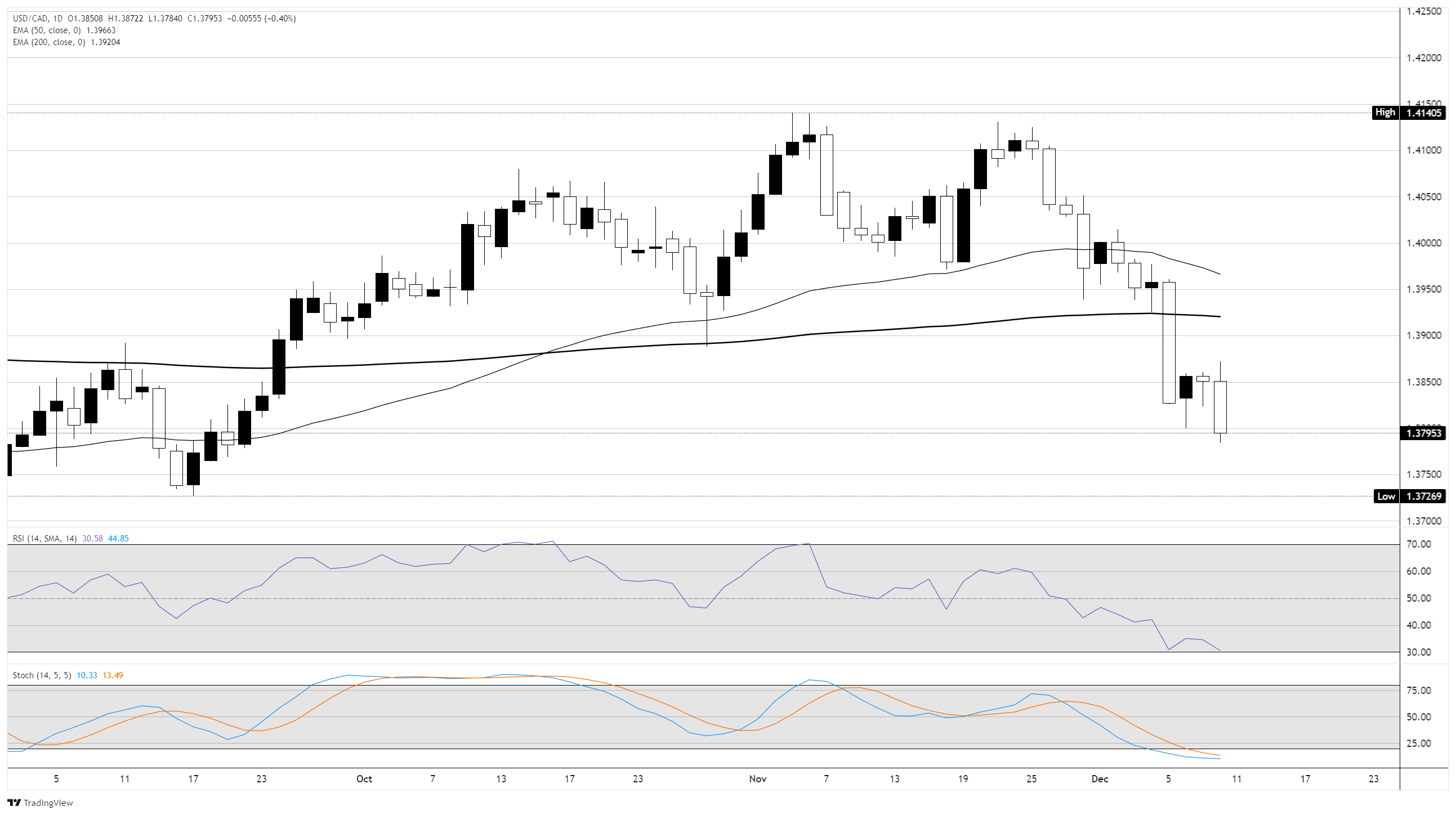 • 加元的周中涨幅使得美元/加元货币对跌至11周低点,首次测试1.3800以下。