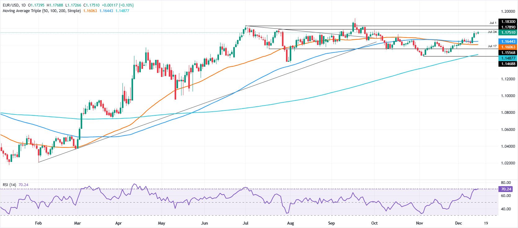 若突破12月11日的高点1.1762,将為1.1800铺平道路,随后是1.1850区域,最终是年内高点1.1918。相反,如果该货币对跌破1.1700,将把焦点转向100日简单移动平均缐(SMA)附近的初步支撑位1.1645,接下来是1.1600关口。