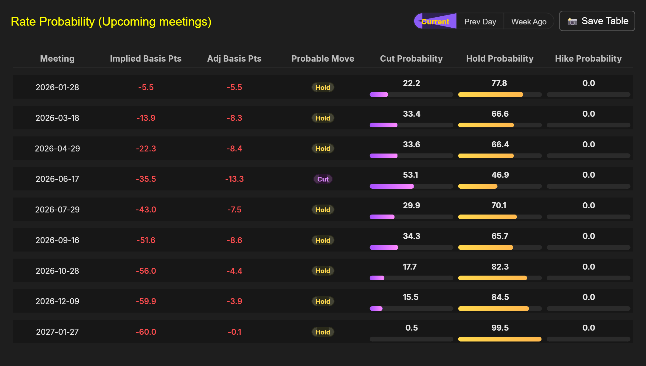 • 根据Capital Edge利率概率数据,市场对美联储在1月28日下次会议上降息的预期保持不变,為22%。侭管如此,投资者预计全年将降息60个基点,首次降息预计在6月。