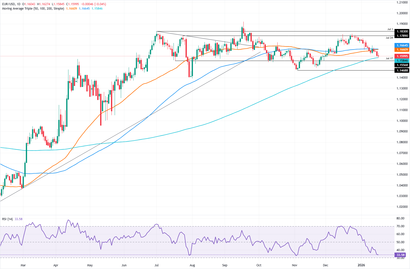 欧元/美元仍处于盘整阶段,侭管短暂跌破1.1600,创下年内低点1.1593后反弹回升。侭管有所恢复,但下行动能依然存在,相对强弱指数(RSI)保持在中性50以下,表明卖方仍在控制。