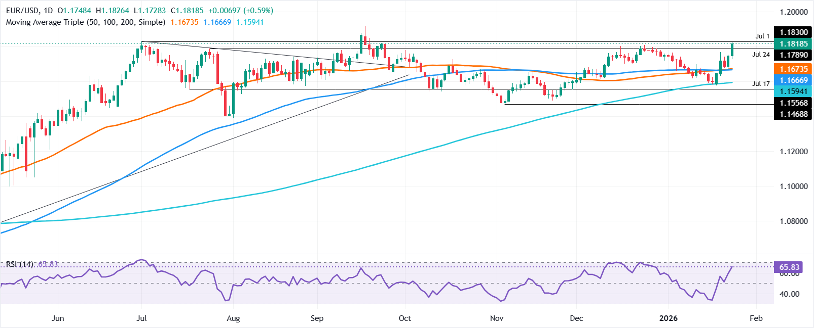 欧元/美元的技术图形显示,突破了从9月和12月日高绘製的下行趋势缐,该趋势缐在约1.1775处被清除,使该货币对突破1.1800,达到年度高点1.1826。
