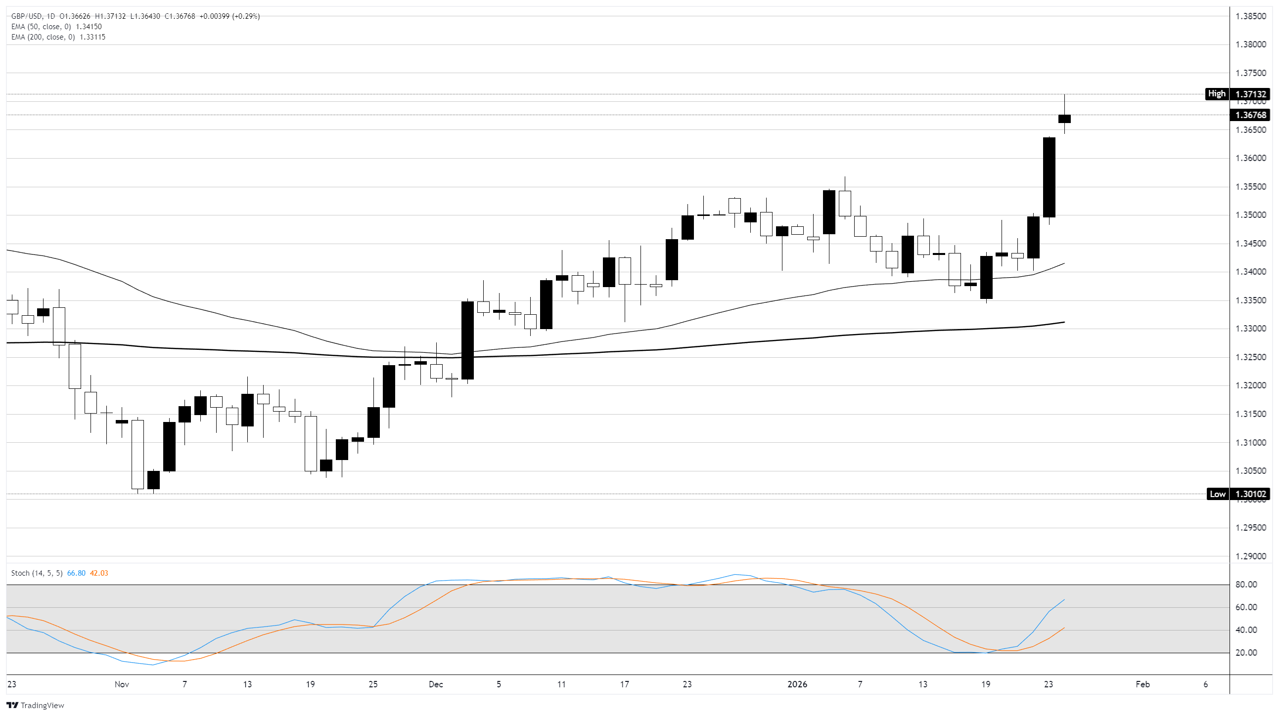 英镑/美元正逐步进入超𧹒区域,周一在1.3700关口触及四个月高点,并在美元持续走弱的情况下标誌著强劲的1月份表现。需要大幅下跌才能将英镑/美元的𧹒盘推回到中间区间,50日指数移动均缐(EMA)徘徊在1.3400区域附近。