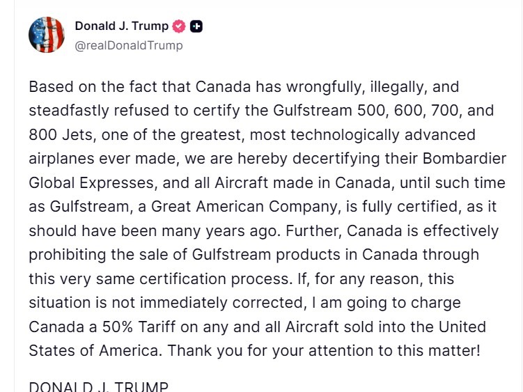 美国总统唐纳德·特朗普周四威胁对从加拿大销售到美国的所有飞机征收50%的关税,指责加拿大不公平地阻碍湾流商务喷气机的认证。