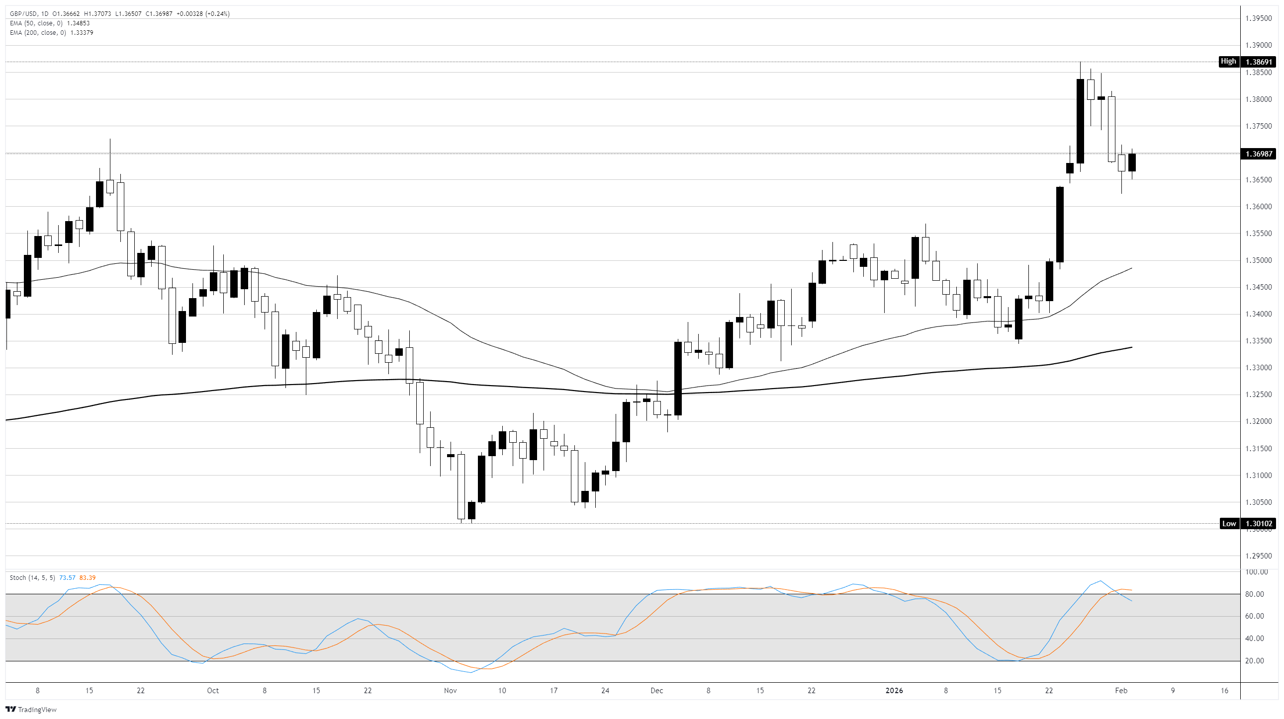 英镑/美元在日缐图上继续保持看涨倾向,价格在从1月27日的1.3869高点回落后保持在1.3700附近。该货币对仍远高于50日指数移动均缐(EMA)1.3485和200日EMA 1.3338,保持中期明显的看涨偏向。