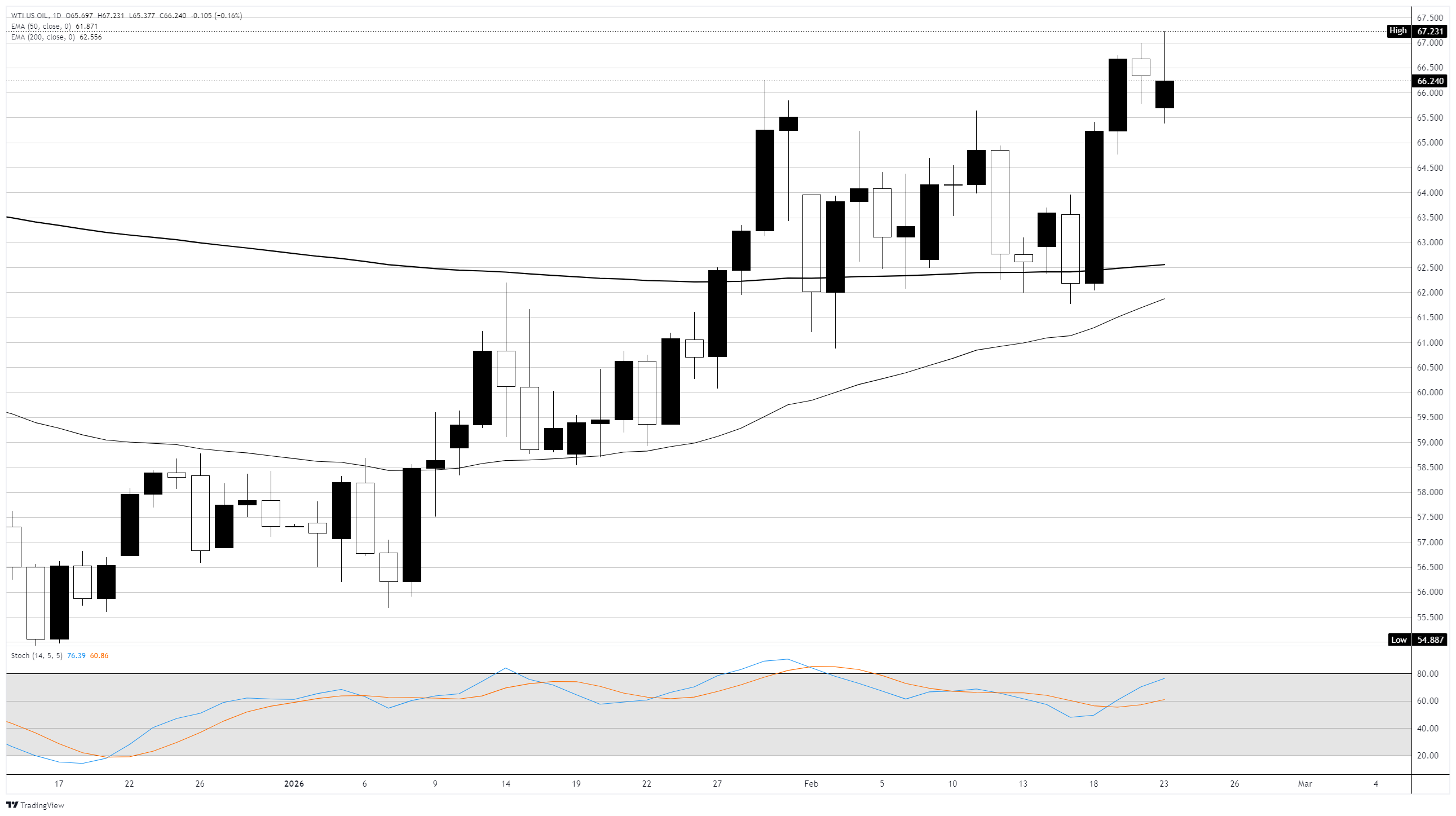 西德克萨斯中质原油(WTI)本周受到相互竞争的力量影响。在供应方面,升级的美伊紧张关係继续支撑价格,此前副总统范斯指责德黑兰未能解决华盛顿在其核计划上的红缐,报告显示美国军方已准备好进行潜在打击。伊朗部分关闭霍尔木兹海峡进行海军演习增加了供应中断的担忧,因為大约每天有2000万桶原油通过该水道。在需求方面,上周五最高法院以6-3的裁决推翻了政府的IEEPA关税,但特朗普迅速宣布根据《贸易法》第122条可能征收15%的全球关税,使贸易政策的不确定性保持在高位。上周美国能源信息署(EIA)数据显示,原油意外减少900万桶,而OPEC+在第一季度继续保持生产稳定,这两者都提供了支撑。