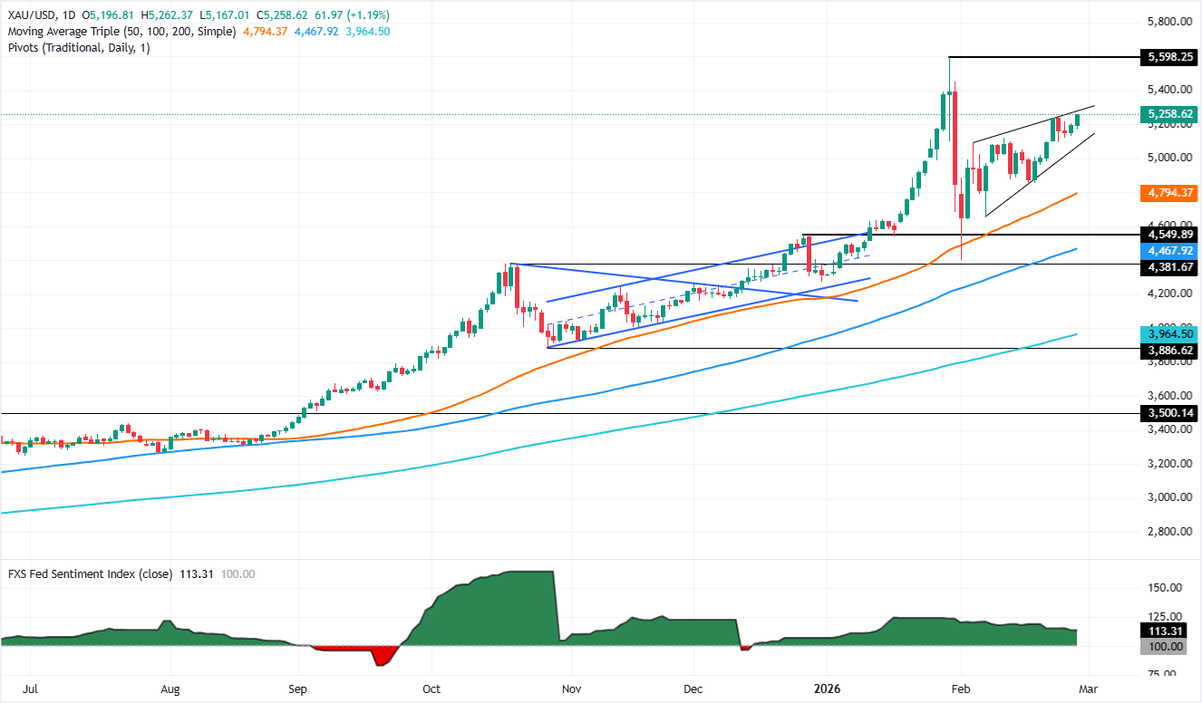 侭管继续上涨,黄金价格似乎准备整固,并忘记抛物缐式的上涨趋势。随著黄金/美元突破5200美元,下一整固区域位于5200美元和5300美元之间,预计价格将上涨。