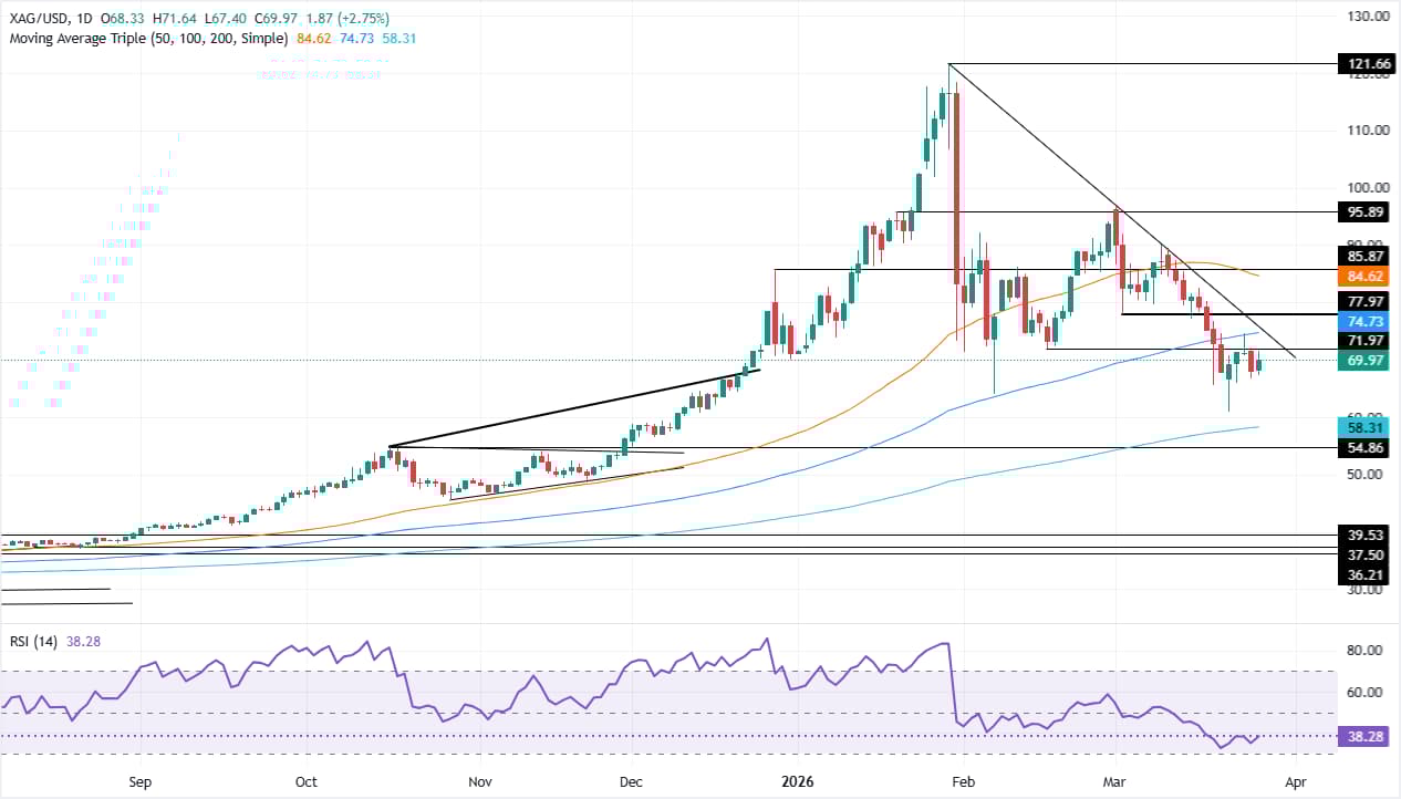 白银价格在跌破100日简单移动平均缐(SMA)后似乎准备进一步盘整,该均缐作為关键阻力位,目前位于73.66美元之上,仍高于现货价格。