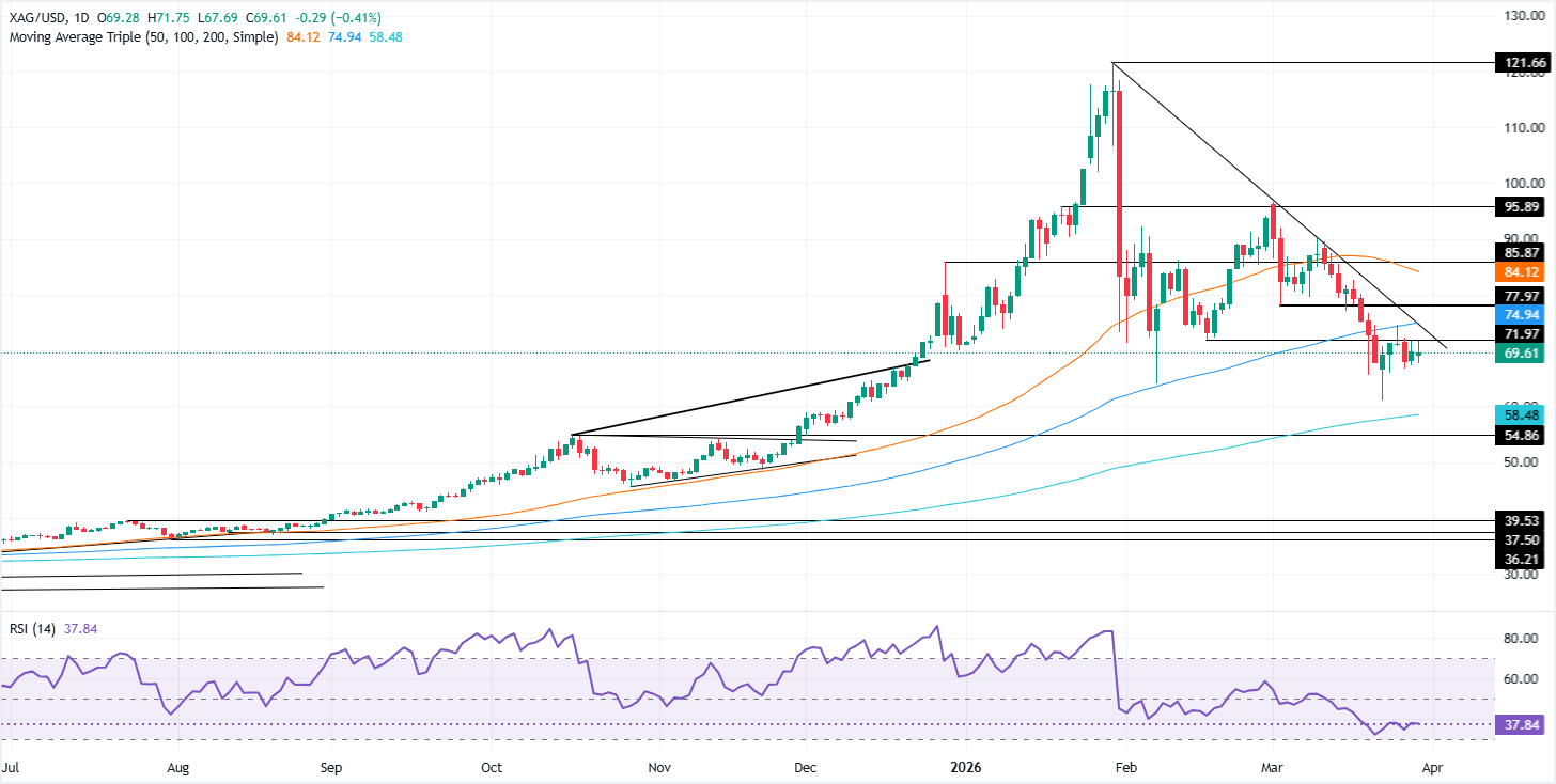 白银价格预测:白银/美元在70美元附近徘徊,受100日简单移动平均缐限制