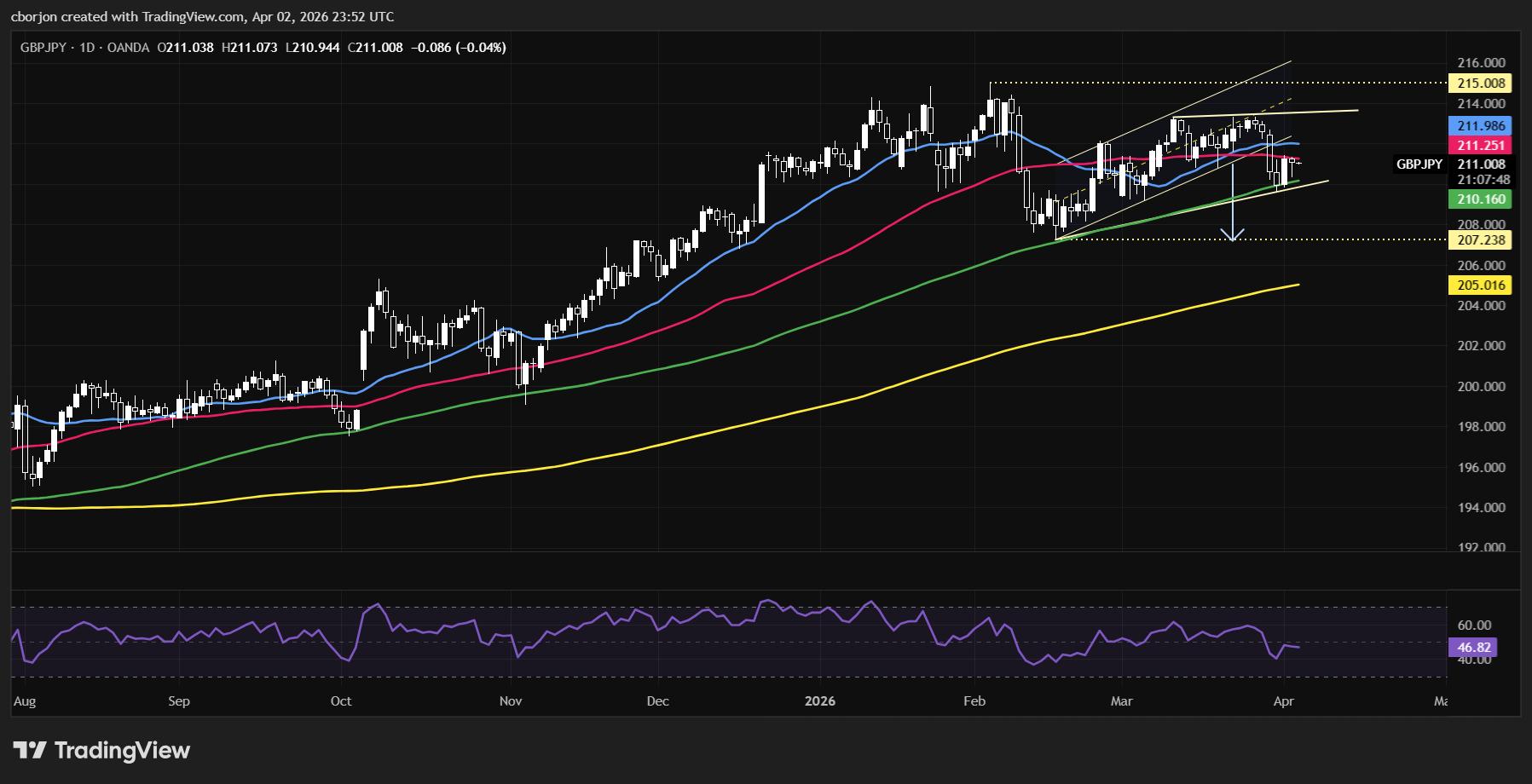 英镑/日元 价格预测:在211.00遇阻,出现上吊缐形态